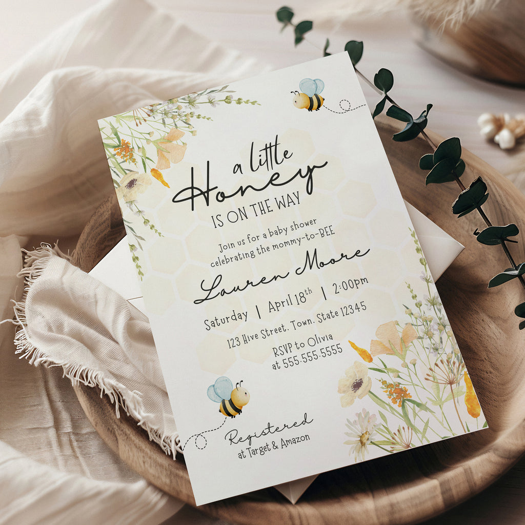 A world of tiny toes, giggles, and dreams. Celebrate the joy and anticipation of the imminent arrival of a sweet "little honey" with a custom honey bee baby shower invitation!